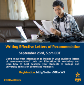 Attention to all high school guidance counselors, teachers, extracurricular activities coordinators! Join us on September 23rd at 5:00 pm EDT to learn how to write successful letters of recommendation for your student’s college or university admissions. Learn about how to introduce your students, and organize helpful background information in this important supplement document. REGISTER HERE.