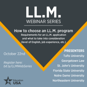 EducationUSA will be hosting the first ever LL.M. Webinar Series between October 19th and October 30th with 50+ Law School presenting on a variety of topics! On October 22nd, tune in to learn more about how to choose an LL.M program, including the requirements for an LL.M. application and what to take into consideration (level of English, job experience, etc.) Register here!
