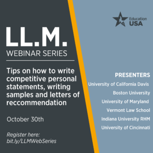 Have questions about LL.M. programs in the United States? The EducationUSA LL.M. Webinar Series is your chance to talk directly to Law Schools about a variety of different topics. On October 30th, tune in to receive tips on how to write competitive personal statements, as well as writing samples and letters of recommendation. Register here!