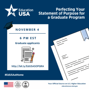 Are you applying to a graduate program and don’t know how to write your Statement of Purpose? Join our EducationUSA session on November 4 at 6 pm ET. Learn along with our experts on how to brainstorm, structure, and organize a stellar Statement of Purpose for a graduate program! Click here to register.
