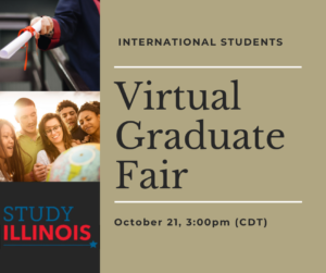 You are invited to join Study Illinois for a virtual Graduate Fair at 4pm ET! Our event will feature virtual chat rooms with our member institution as well as presentation with seven Illinois universities for a virtual fair to learn about post-graduate educational opportunities in the State of Illinois! The fair will be panel-style, consisting of four presentations centered around a variety of topics. Each presentation will be 20 minutes in length with 10 minutes for question and answer. The topics will include the following: “Introduction to Study Illinois”; “Understanding Required Documentation for Graduate School”; “Finding a Supporting and Welcoming University”; and “Graduate Opportunities: Exploring Types of Internships and Tips to Get Them”. Presenting universities include University of Illinois – Springfield, Illinois Institute of Technology, University of Chicago, University of St. Francis, The Chicago School of Professional Psychology, Northeastern Illinois University, and Northern Illinois University. In addition the credential evaluation organization Educational Perspectives will also be participating. Students can also enter chat rooms to speak with representatives from over 20 Illinois institutions!