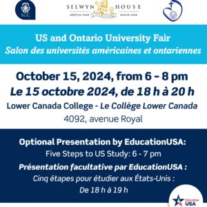 Venez au Lower Canada College à Montréal pour le Salon des universités des États-Unis et de l’Ontario. L’événement se déroulera de 18h00 à 20h00 au gymnase Memorial situé au 4092 avenue Royal, avec une présentation d’EducationUSA de 18h00 à 19h00 sur le processus de demande d’admission aux universités américaines.