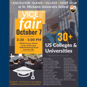 Meet more than 30 US Colleges and Universities on October 7th with the Vancouver Island College Event (VICE) at St Michaels University School (SMUS) in Victoria BC! This event runs from 3:30 – 5:00pm PDT or 6:30 – 8:00pm EST and is free to all students, hosted in SMUS Senior School. Specifically in the single gym at 3400 Richmond Road, Victoria, BC.